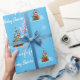 Belo papel azul de embrulho com ursinho de pelúcia sorridente, flocos de neve incríveis e pequenos presentes vermelhos e corações nele. Personalize-o com qualquer texto desejado. Perfeito para enrolar presentes no chá de fraldas)