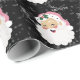 Que entusiasmo sua filha estaria na manhã de Natal para ver pacotes com esse Papai Noel vestindo um chapéu rosa e seu nome escrito por todo o presente? Os flocos de neve estão espalhados sobre o fundo preto.