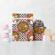 O Chef Italiano Pizza é um design de arte gráfica digital. Um homem gordo pequeno vestindo uma jaqueta de chefs e um chapéu em frente a um pepperoni e pizza de queijo em uma frigideira de prata. O texto decorativo vermelho ativado diz: PIZZA. O fundo é um fundo sombreado de quadrados vermelhos, brancos e negros. Este papel de embalagem de pizza está disponível em cores variadas. Estão disponíveis suprimentos de pizza coordenados.