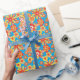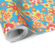 Um rolo de muito na moda Wrapping Paper, com um padrão de flores vermelhas, laranja, amarelas sobre um fundo turquesa brilhante, de uma colagem de papel pintada à mão por Judy Adamson.