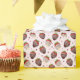 This adorable gift wrap is light pink and features a pattern of chocolate covered strawberries.