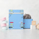Um design bonitinho com pouca escolta treina em cores brilhantes com uma fumaça saindo do topo. Um fundo azul macio.