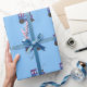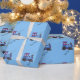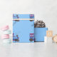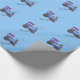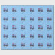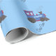Um design bonitinho com pouca escolta treina em cores brilhantes com uma fumaça saindo do topo. Um fundo azul macio.