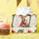 A cute Christmas sprite delicately playing a harp, set against a backdrop of beautiful sheet music