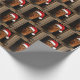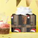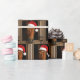 A horse wears a red Santa hat as it peeks out from a wooden stable, its warm tones beautifully contrasting with the festive colors
