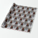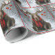 In a snowy forest, a moose sits gracefully, adorned with a bright red scarf and festive red baubles hanging from its antlers