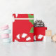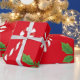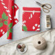 This image shows a red background featuring green holly leaves and a candy cane with white and red stripes. It is a festive wrapping paper design perfect for wrapping Christmas gifts.