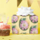 O invólucro bonito de prenda florado é decorado com um padrão de trabalho de arte floral que representa uma flor de crisântemo branco roxo e cremoso, com um botão e uma folha colocados contra o ocre ouro e o verde-oliva num pano de fundo amarelo da manteiga.