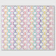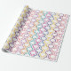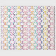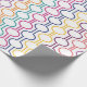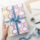 Este papel de embrulho tem um design de arte de laranja, turquesa, rosa, azul, púrpura e amarelo, se conecta a linhas em um campo de branco.