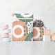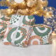Este papel de embrulho tem um design de círculos decorados com linhas e círculos feitos de pontos repetidos em verde-retrô e coral.