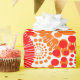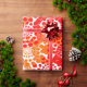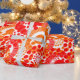 Este papel de embrulho tem um design de círculos decorados com linhas e círculos feitos de pontos repetidos em vermelho e laranja.