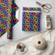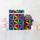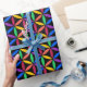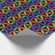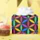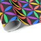 Desenho geométrico abstrato de círculos entrelaçados, cores vibrantes de arco-íris em fundo preto
