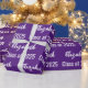 O papel de embrulho é roxo real. Ele tem um padrão de texto para o nome do formando e Classe de 2025. O nome (Mostra: Elizabeth) aparece em um roteiro branco elegante. O outro texto também é branco. Todo o texto pode ser editado.