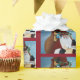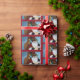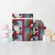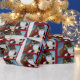 Victorian Santa Clause checando sua lista imprópria ou legal. Um chapéu vermelho com óculos e um saco de brinquedos todos num pano de fundo azul.