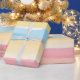 This beautifully wrapped gift box features a pastel color scheme, accented with a shiny red ribbon and a large bow. The box is set amidst festive pine branches, decorative pinecones dusted with white, and vibrant Christmas ornaments, creating a joyful and celebratory holiday atmosphere.
