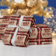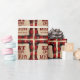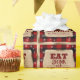 Este papel de embrulho de presente personalizado apresenta um tema de Natal festivo. O fundo apresenta um padrão de xadrez vermelho de Buffalo, rústico, espalhado com flocos de neve. Um poster de papel pergaminho vintage é impresso no centro e enquadrado com uma borda de estilo folha de ouro. A frase "Coma Bebida e Seja Feliz" é impressa no topo com uma letra vermelha e enterrada, seguida de um nome de família de amostra. A imagem é colocada sobre o papel de empacotamento que você pode personalizar para incluir seu próprio nome personalizado ou outro texto.