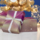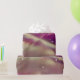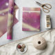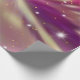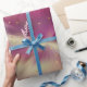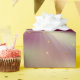 Fundo abstrato com feixes de luz radiantes em matizes cor-de-rosa e roxas, adornados com confete de ouro espalhado e estrelas cintilantes.
