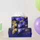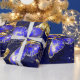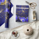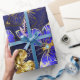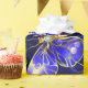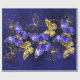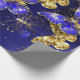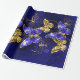 Composição de borboletas luxuosas de safira e joias de ouro em fundo azul texturizado.