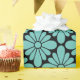 Esse padrão divertido e moderno lembra designs de flores de concho prateadas frequentemente vistas em cintos e joias no sudoeste americano. O padrão apresenta flores em forma de diamante aqua em fundo preto