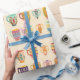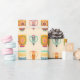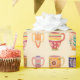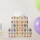 Diversas xícaras coloridas de café e chá com diferentes padrões florais e cardíacos são dispostas em um padrão repetitivo contra fundo branco. Cada xícara apresenta uma combinação única de cores e designs, criando uma exibição vibrante e simétrica.