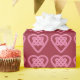 Um simples invólucro cardíaco de nó celta rosa, contra um fundo vermelho.