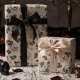 Este divertido papel de embrulho gótico feminino é desenhado à mão a tinta preta por Nathalie Portet, com crânios brancos e rosas cor-de-rosa e creme e teias de aranha contra um fundo branco antigo.