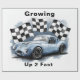 Uma ilustração encantadora de aquarela perfeita para uma festa de aniversário temática de carros de corrida! Apresentando um carro de corrida para crianças azuis empoeirado com rodas pretas, em conjunto com bandeiras arrojadas de controle preto-e-branco. Colocada contra um pano de fundo azul empoeirado, a design é completada com o texto lúdico "Crescendo 2 rápido." Ideal para convites de festas, decorações ou guardas para celebrar o dia especial de estilo da sua pequena corrida!