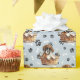 Um adorável cachorrinho marrom e branco, em um cesto mais vestido, é a característica do padrão nesse papel de embrulho de presente, sempre. O retrato está em meio a um padrão de estampas pretas e ossos brancos, e é repetido sobre fundo azul-prateado. Perfeito para qualquer amante do Boxer Dog!