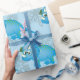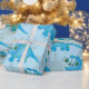 his adorable and fun Christmas wrapping paper is perfect for dinosaur lovers! It features a repeating pattern of a cute blue Triceratops wearing a festive little green Christmas wreath around its neck. The background is a soft blue, scattered with subtle gray and white snowflakes, giving it a cool, winter wonderland feel. This whimsical cartoon design is an excellent choice for kids, boys, or anyone who loves a unique, non-traditional holiday theme. Make your gifts stand out under the tree with this charming and playful gift wrap!