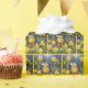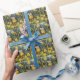 Um rato de cinza giro vestindo uma mancha amarela e botas em um jardim de affodilo na chuva.