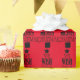 Papel de embrulho de Natal com texto preto que lê: "Desejamos-lhe um Feliz Natal em forma de árvore de Natal!" Você pode personalizar o fundo vermelho para ser qualquer cor que quiser.
