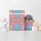Arte moderna com um fundo rosa, azul e amarelo e uma placa de pintura com impressão de plástico branco com bolha de tinta.