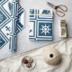 Design com temas náuticos, com roda de vela, barco à vela, bússola e decoração da âncora, em quadrados brancos e azuis com faixas