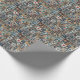 Aparece uma colcha colorida com uma variedade de padrões de retalhos, cada quadrado com designs e tecidos diferentes.