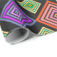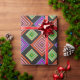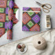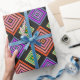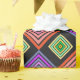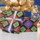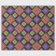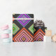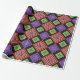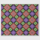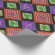 Este papel de embrulho tem um design geométrico de diamantes concêntricos em laranja e rosa, azul e roxo, amarelo e verde, sobre fundo preto.