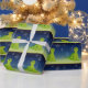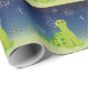 Um design de feriado divertido com dinossauros verdes e bonitos com caudas compridas numa noite de neve com muitos flocos de neve bonito caindo. Enrole seus presentes neste plástico de presente de dinossauro de inverno.