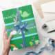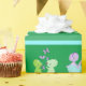 Enrole seus presentes em um estilo adorável com esse papel de embrulho de presente de dinossauro fofo. O papel de enrolar tem um padrão de dinossauros bebês e borboletas roxas fofinhas (e um bebê dinossauro está mesmo eclodindo de sua concha!). Também no padrão estão palmeiras, arco-íris e sóis. Personalize o presente com o nome do seu filho ou filha.