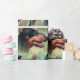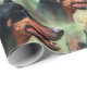 Um ligeiro efeito de desenho animado nesta imagem de um cão Doberman Pinscher com orelhas cortadas contra um esquema de cor verde de fundo em madeira. Perfeito para o amante do cachorro Dobie em você!