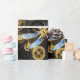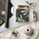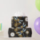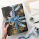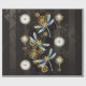 Marcadores e teclas antigas com engrenagens de ouro e latão, decoradas com libélulas mecânicas e boias em fundo castanho e listrado.