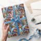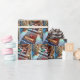 A neve cobrir levemente o chão como um drone paira sobre um tapete de boas-vindas oferecendo um presente de Natal adornado com um arco vermelho