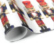 Este papel colorido de embrulho apresenta um baterista tradicional de madeira em um fundo branco, perfeito para embrulhar todos os presentes de Natal.