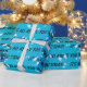 Bolhas transparentes flutuando sobre fundo azul neon e gradiente de turquesa com texto "É tudo sobre você hoje". O texto pode ser alterado.