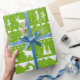 Um brilhante verde limão colorido tropical e papel de embalagem branco de férias com um padrão de suéter nórdico de animais de inverno como a raposa-árctica, a rena-stag e uma família de ursos polares com flocos de neve, cones de pínus, florestas e estrelas.