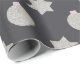 Christmas gift wrap adorned with silver glitter stars and baubles (simulated in art work no glitter used)
