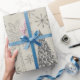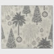 Wrap your holiday gifts in style with this elegant monochromatic Christmas wrapping paper. Featuring a sophisticated pattern of detailed pine trees, palm trees, and snowflakes in shades of grey and cream. Perfect for a chic, modern, or rustic holiday aesthetic. Pair it with a vibrant blue ribbon for a beautiful finishing touch. Ideal for Christmas, winter birthdays, or any special occasion needing a touch of refined artistry.