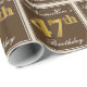 Este simples e elegante design de papel de embrulho apresenta uma mensagem personalizada como "ANameHere's 47th Birthday" (com o "47º" a ter um visual falsa/imitado de cor dourada) dentro de uma área quadrada de cor castanha com um contorno de fronteira simples. O nome está em um texto elegante, de cor branca, semelhante a script, e pode ser personalizado. Um papel de embrulho como este poderia talvez ser usado ao embrulhar presentes de aniversário para alguém que comemora seu quarenta e sétimo aniversário. [~Z0000223]