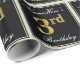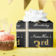Este simples e elegante design de papel de embrulho apresenta uma mensagem personalizada como "NameHere's aniversário de 3 anos" (com o "3º" com um aspecto de cor falsa/imitação em forma de ouro) dentro de uma área quadrada de cor preta com um contorno de fronteira simples. O nome está em um texto elegante, de cor branca, semelhante a script, e pode ser personalizado. Um papel de embrulho como este poderia talvez ser usado ao embrulhar presentes de aniversário para alguém que comemora seu terceiro aniversário. [~Z0000217]