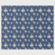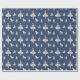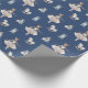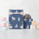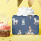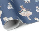 Papel clássico e elegante, mas encantador, de embrulho de presente com bailarina, cavalo de balanço e padrão decorativo de relógio. Fundo azul.