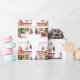 Elfo de Natal com um saco de presentes em frente a um compro de doces nevados