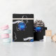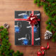 ornamento de feriado azul com fita branca e pérolas isoladas em preto. Feliz Natal está em uma etiqueta branca na fonte do script do rico.